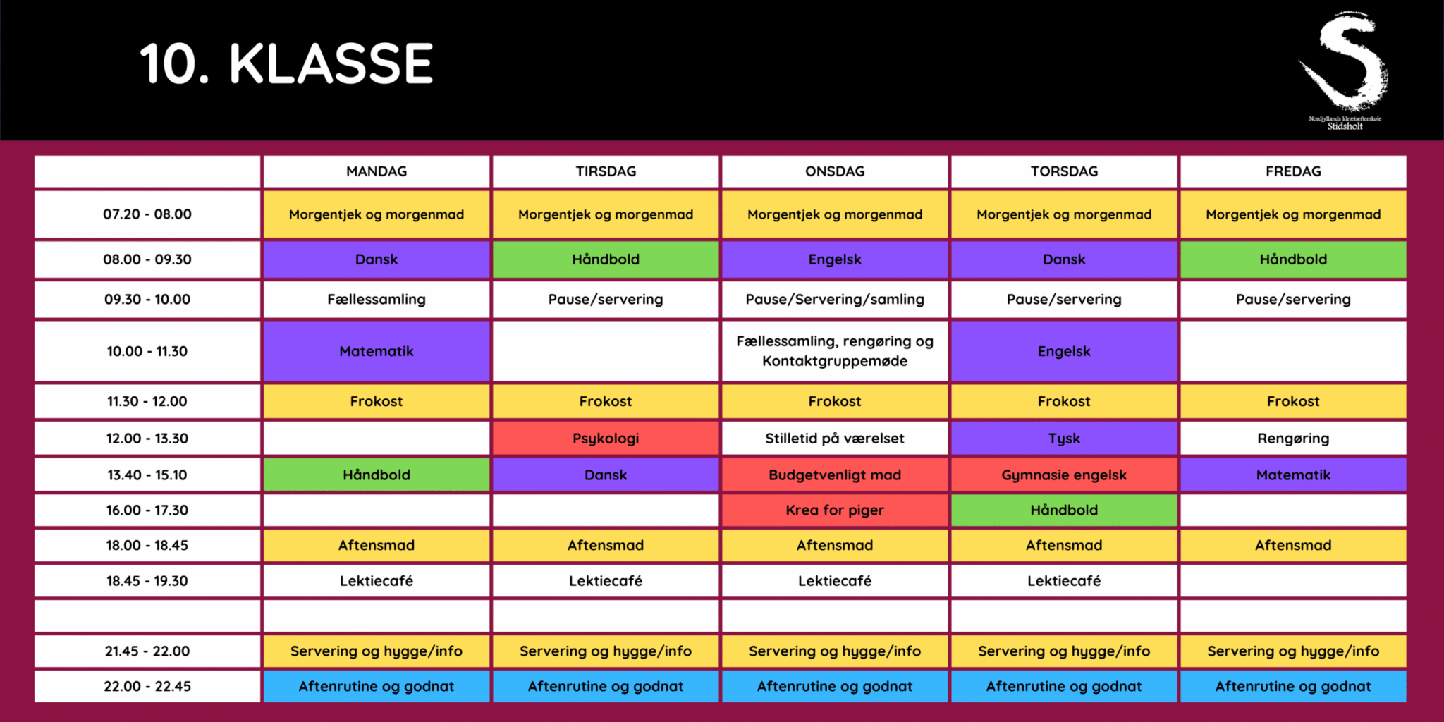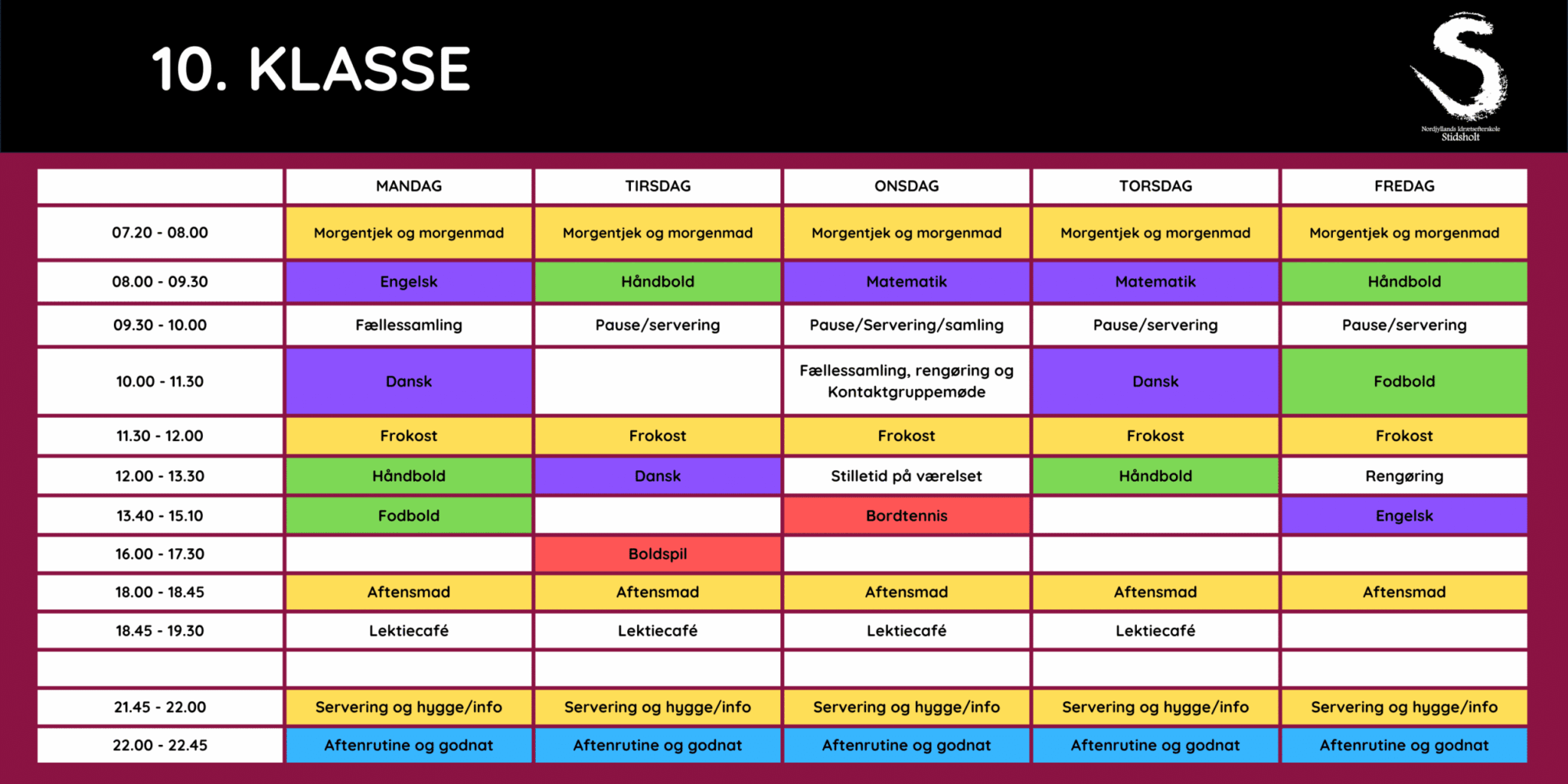 Vi har lavet et par eksempler på hvordan et skema for 10. klasse på Nordjyllands Idrætsefterskole Stidsholt evt. kan se ud.